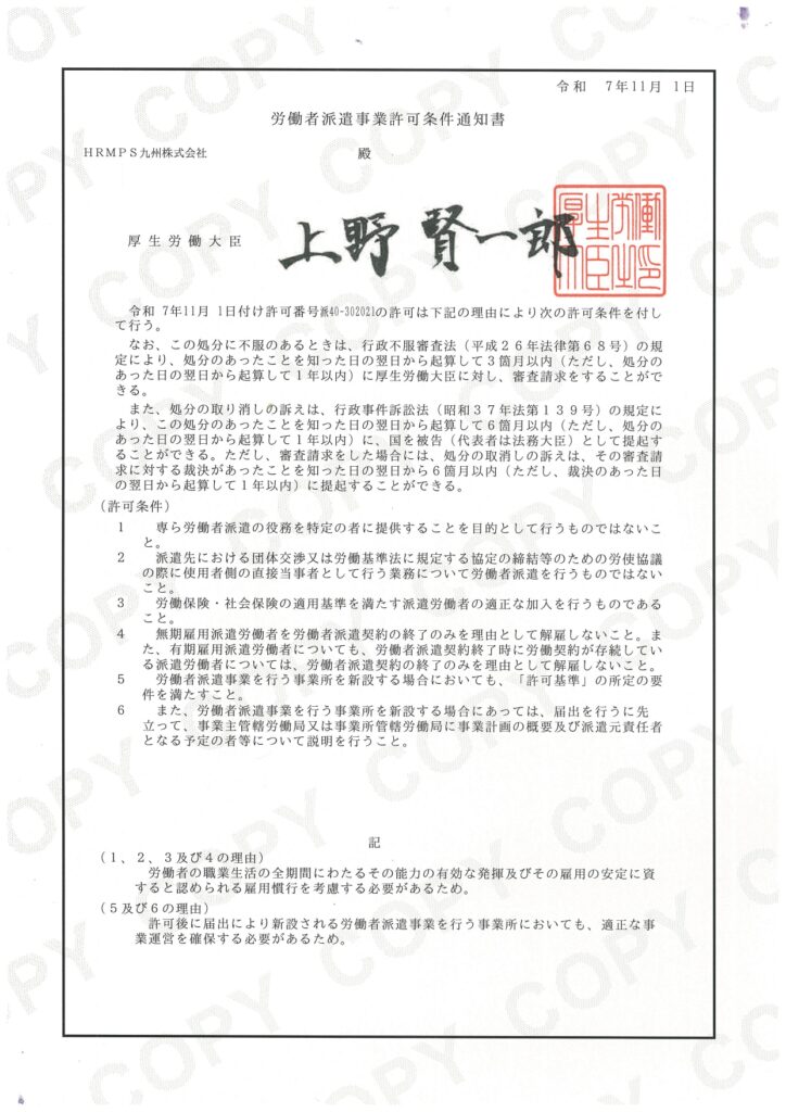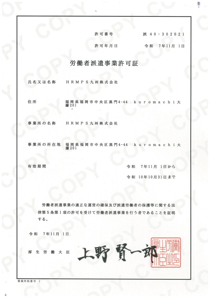 HRMPS九州株式会社(福岡市中央区。代表取締役(派遣元責任者):斉藤隼人)は、令和7年11月1日より、労働者派遣事業の許認可を取得いたしました。